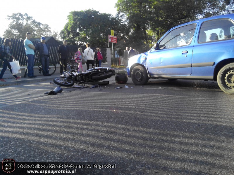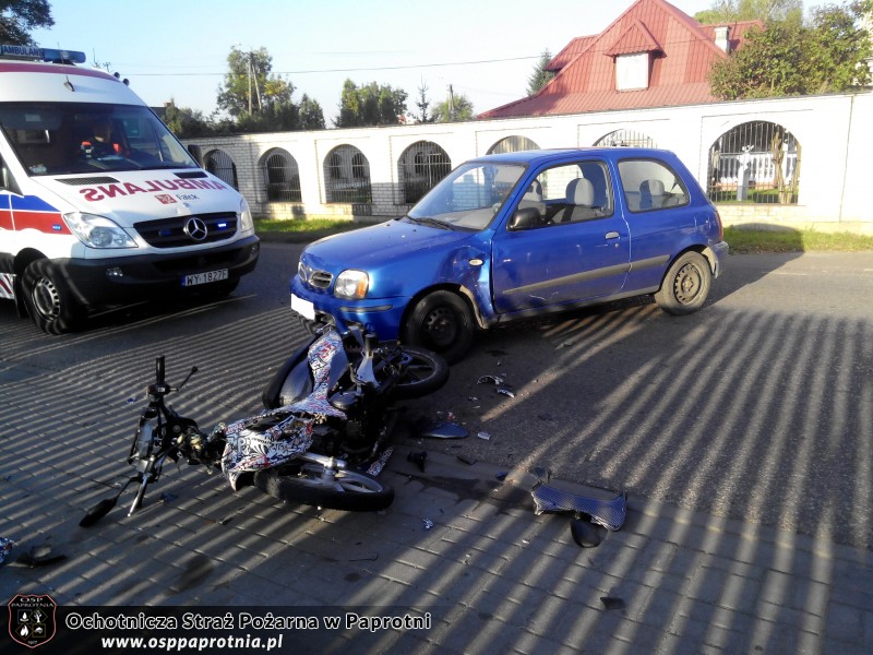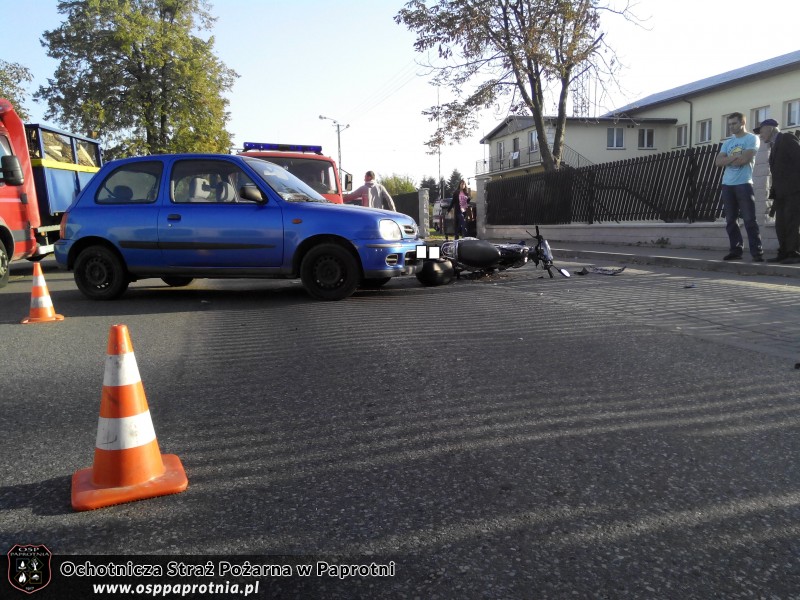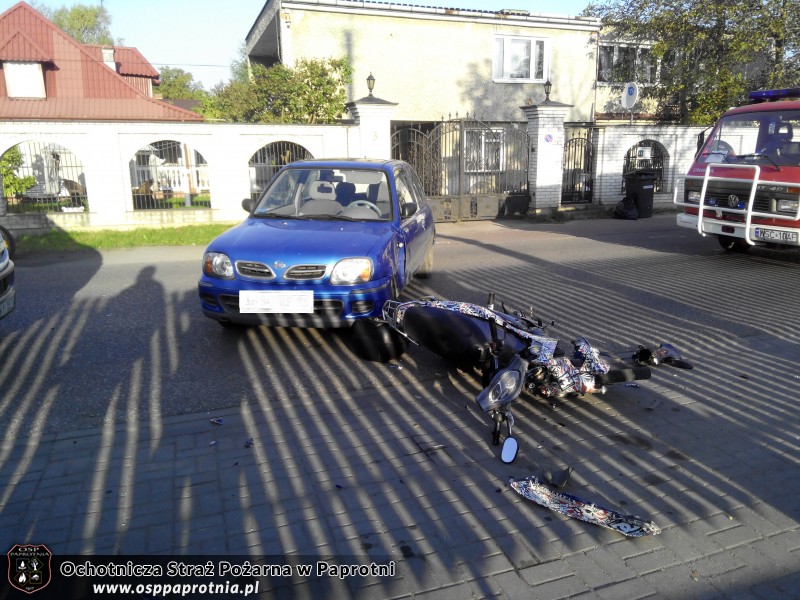 Dnia 19.09.2014 o godzinie 7.30 Osp Paprotnia została zadysponowana do kolizji drogowej na ulicy Kampinoskiej, w której udział brał Nissan Micra i skuter Kumiko. Poszkodowany został kierowca skutera. Z lekkimi obrażeniami został zabrany do szpitala. Działania strażaków polegały na odłączeniu akumulatora w rozbitym skuterze i pomoc w kierowaniu ruchem. Udział brało 4 strażaków