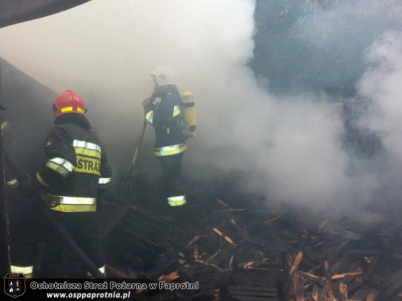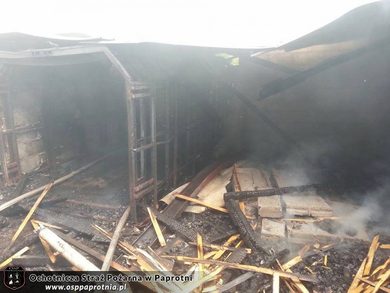 O godz. 15.44 OSP Paprotnia została zadysponowana do zadymienia w miejscowości Seroki. Po przybyciu na miejsce około 200 metrów od drogi, za zaroślami zobaczyliśmy pustostan. W jego tylnych pomieszczeniach pożar był już bardzo rozwinięty. Po podaniu linii głównej i jednej roty, przystąpiliśmy do działania. Działania były utrudnione poprzez brak dojazdu do budynku. Zaraz po nas działania z drugiej linii gaśniczej rozpoczęło OSP Niepokalanów. Następnymi środkami były JRG Sochaczew, OSP Teresin oraz OSP Szymanów. Działania prowadziliśmy z różnych stron w obawie, że może zawalić się dach. Parę minut później dach uległ zawaleniu. Przy pomocy pił rozcinaliśmy blachę i usuwaliśmy w celu dostania się do płomieni. Po opanowaniu pożaru nastąpiło przewalanie spalonych elementów oraz dogaszanie. Akcja trwała ponad 4 godziny.